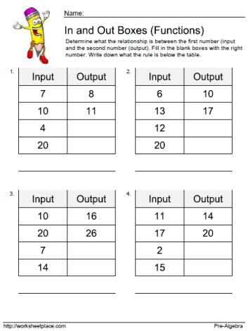 In and Out Worksheets - Math Worksheets 4 Kids These printable in-out worksheets for help 2nd grade, 3rd grade, and 4th grade kids understand how pattern or function works. Addition or Subtraction Write the Rule - 1 Write the Rule - 2 Grab 'em All Multiplication or Division Identify the Rule - 3 Identify the Rule - 4 Grab 'em All All the Four Operations In-Out Table - 5 In-Out Table - 6
